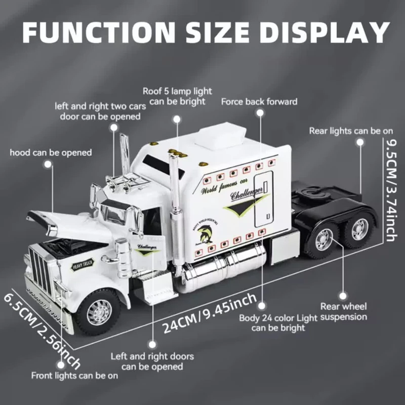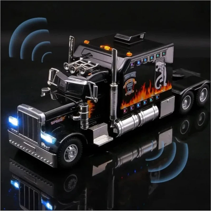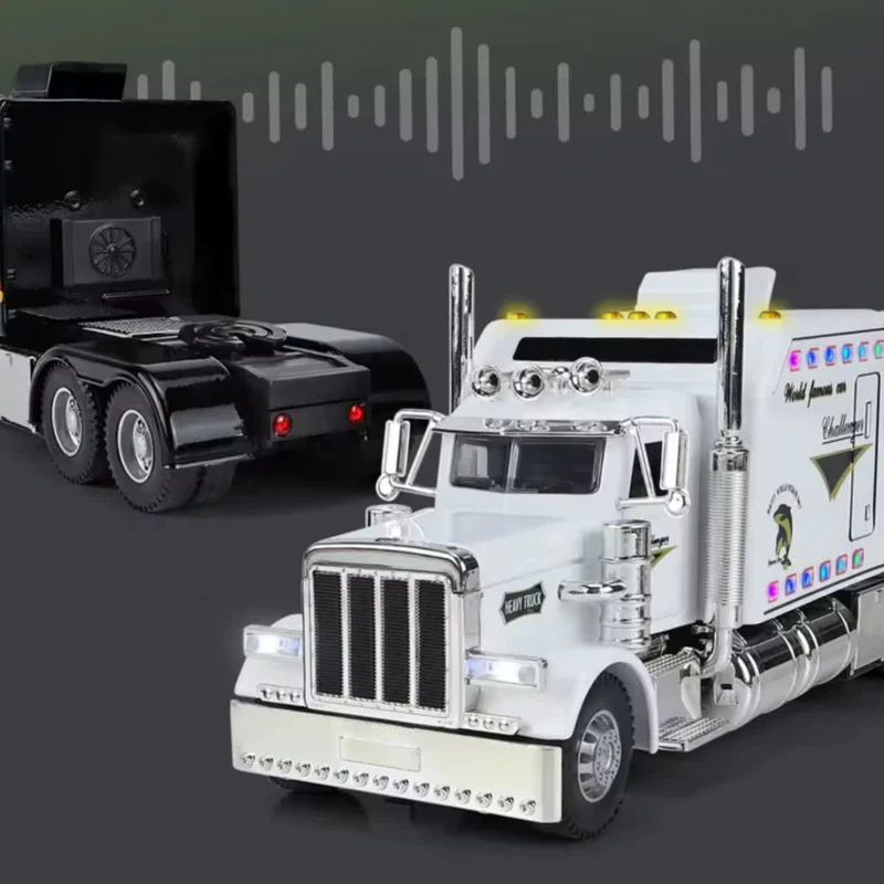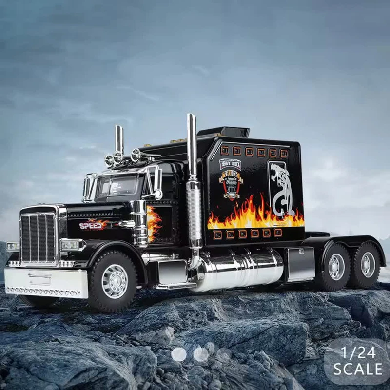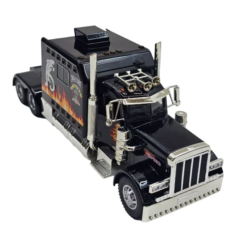 ماکت ماشین مدل تریلی آمریکایی پیتربیلت فلزی کشنده تراک بزرگ 1:24 کینگس دارای سه موزیک افکت صدای کامیون ماک و چراغ های جلو و عقب و بدنه به همراه رقص نور هماهنگ با افکت صدا -کاپوت و در ها بازشو-دارای موتور مکانیکی عقب کش است عقبکش وچراغ دار و دارای کاپوت بازشو و اسکیل ۱:۲۴ و دو درب جلو بازشو و با رنگ جذاب مشکی و سفید و اندازه ۲۴ سانتی متر و دارای لاستیک های گوشتی وکمک فنرهای جلو و عقب دارای سه مود موزیک و چراغ و جنس بدنه از فلز و فلاپ متریال بالا میباشد.
